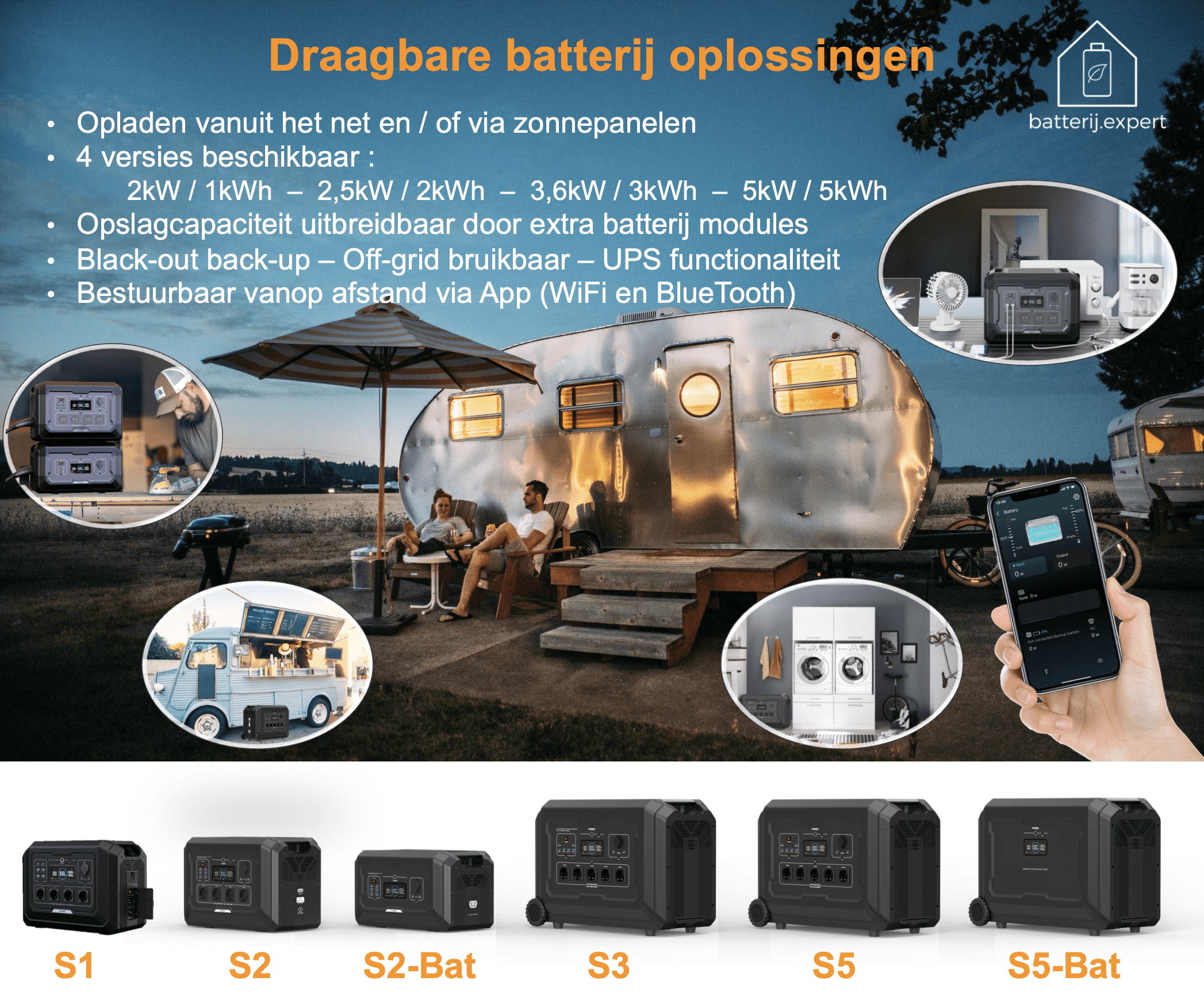 Er zijn 4 basis versies met elk hun specifieke uitgangsvermogen/opslagcapaciteit en 2 batterij uitbreidingsmodules beschikbaar. Voor elke toepassing hebben we dus wel een gepaste draagbare oplossing beschikbaar :
