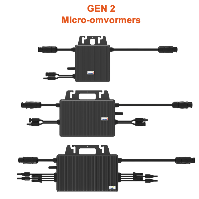 GEN2 Micro-omvormers : Voor 1 zonnepaneel met 300W en 350W AC vermogen, voor 2 zonnepanelen met 700W AC vermogen en voor 4 zonnepanelen met 1.500W AC vermogen.