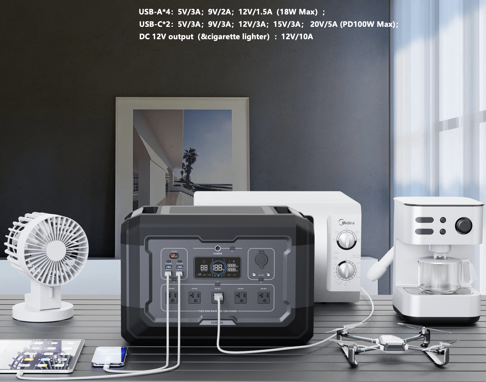 - Outputs : USB-A / USB-C / 12Vdc / 230Vac (2.500W).